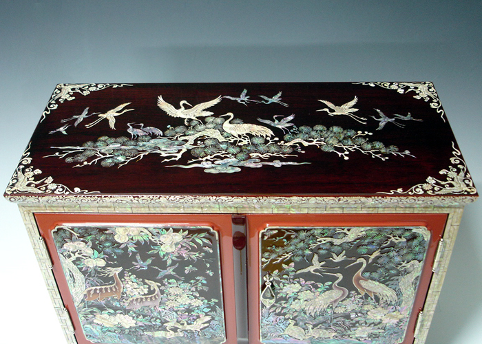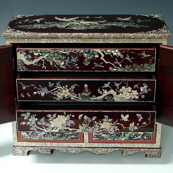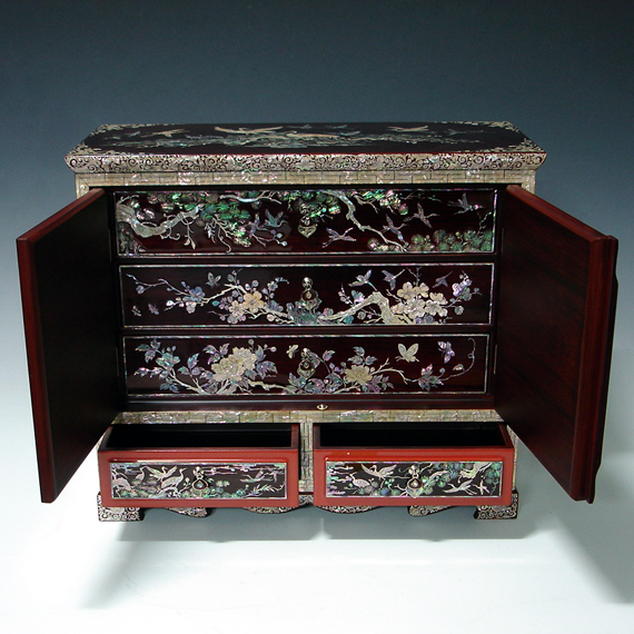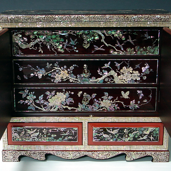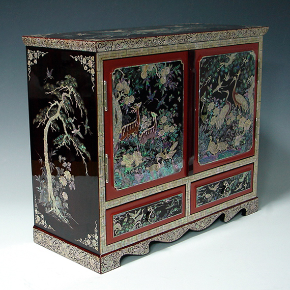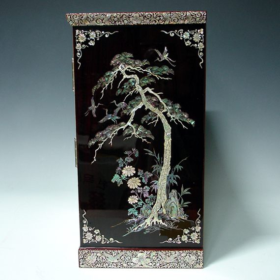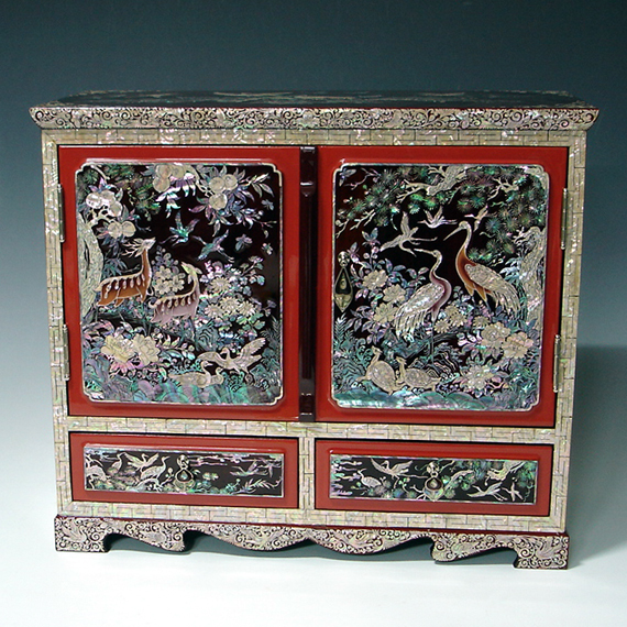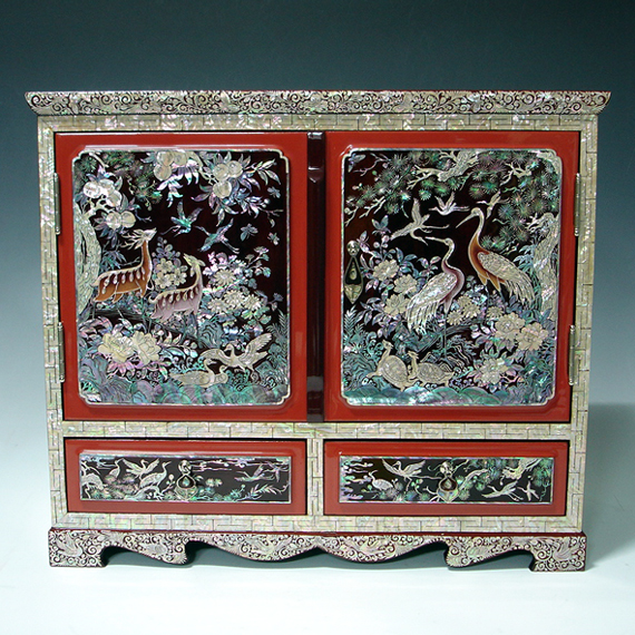 This exquisite big jewelry box is lavishly decorated with a mother of pearl design of sipjangsaeng, 10 creatures that ancient Koreans, influenced by the Taoist philosophy, believed were created to enjoy eternal youth: sun, stone, water, cloud, pine tree, deer, bulnocho ('herb of eternal youth'), turtle, crane, and mountain. Inspired by the belief in a Taoist utopian world resided by Taoist elders who had found the secret of eternal life, ancient Koreans revealed their dreams of such a world through the 10 creatures.