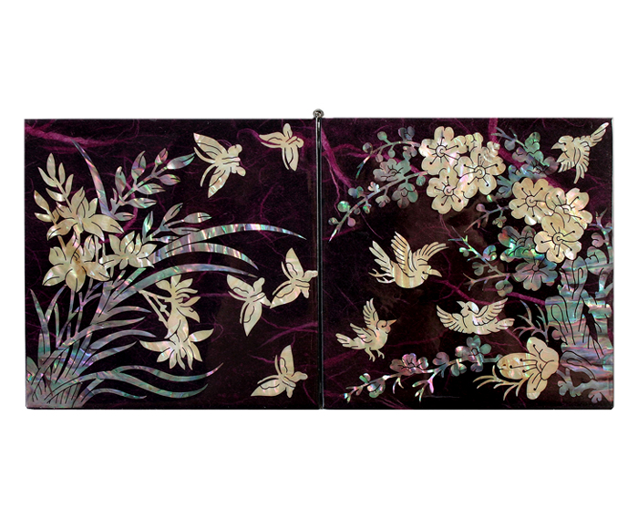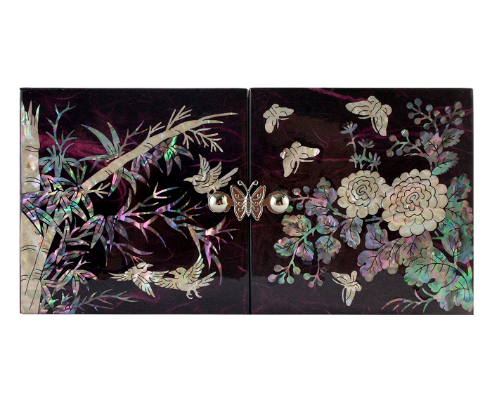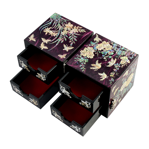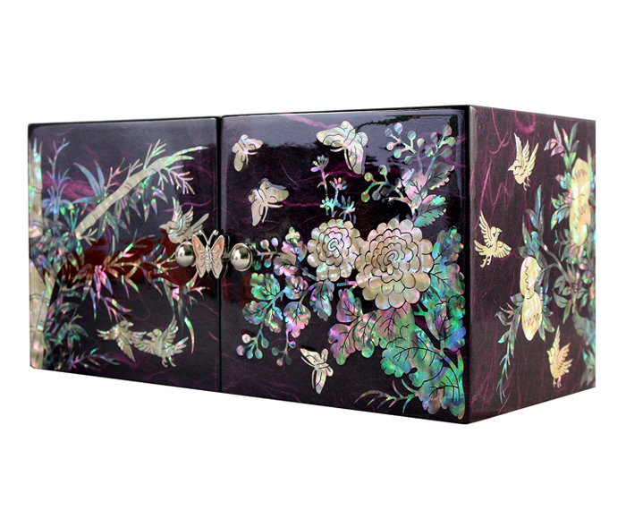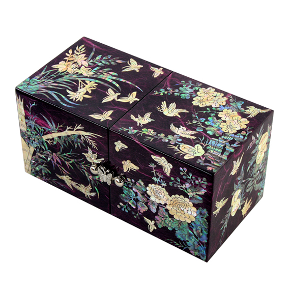 Two cubic handcrafted wooden jewelry boxes lavishly decorated with mother of pearl designs are connected with each other through two hinges. Each box has two drawers. The mother of pearl design of this jewelry box depicts Sagunja, or "four noble beings," containing four plants, maehwa (spring), orchid (summer), chrysanthemum (autumn) and bamboo (winter) that symbolize the four seasons. virtues in Korea. Maehwa refers to the Korean plum blossom that has long been the herald of spring. Korean artists have been fascinated by maehwa, which blooms at the end of winter, and thus have praised it as a symbol of the noble spirit overcoming all hardships. The orchid that emits a fragrant aroma in a deep valley, symbolizes a noble sage leading an austere life. Symbolizing fidelity and loyalty, the chrysanthemum has been one of the most favorite subjects used for adorning craftworks as it blooms until late autumn, thus overcoming the frost. The bamboo symbolizes loyalty as its leaves and stalks stay green throughout the seasons. The elaborate adornment with the iridescence of intricate mother of pearl designs makes it a breathtaking piece for storing personal fashion items.