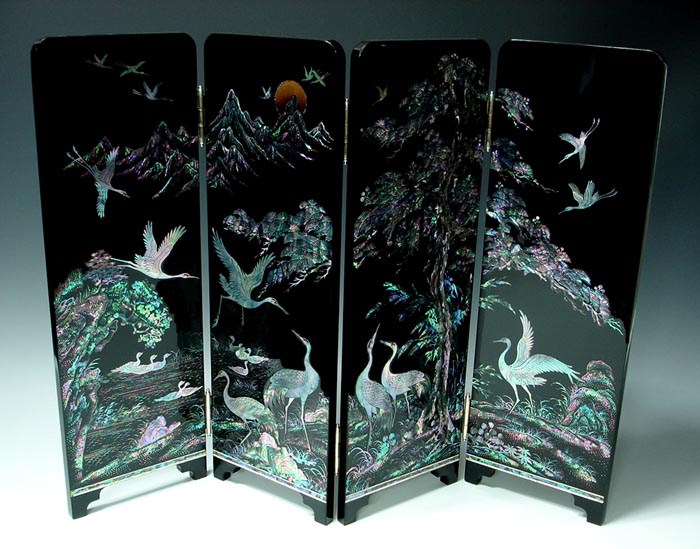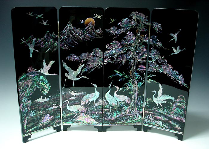 Designed to ornament a corner or section off part of a room, this small folding screen depicts a serene image of cranes delighting in an idyllic moment under an old pine tree and the full moon. The elaborate adornment with the iridescence of intricate mother of pearl designs makes it an impressive item for collection. Read More