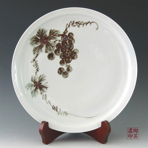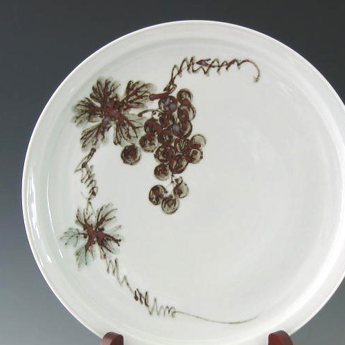 This iron-painted white porcelain grapes plate for dinner table featuring a grape vine with luscious grapes hanging from it offers an area of empty space for someone to write a message to their loved one. This plate makes a perfect gift for someone special. Iron-painted porcelain wares of Korea feature brisk brush strokes, powerful color contrasts, and a gracefully simple form, giving it an aloof dignity that differentiates it from Chinese and Japanese counterparts. Read More