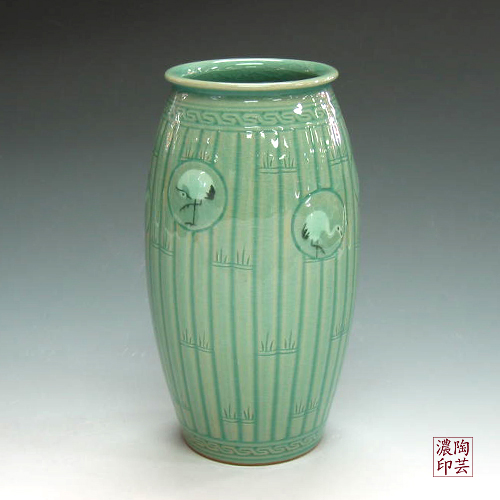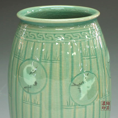 Porcelain Urn Vase Inlaid with Celadon Bamboo and Crane Design