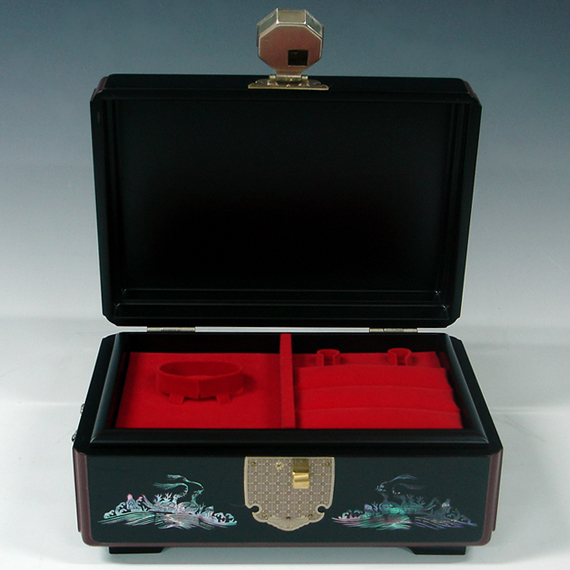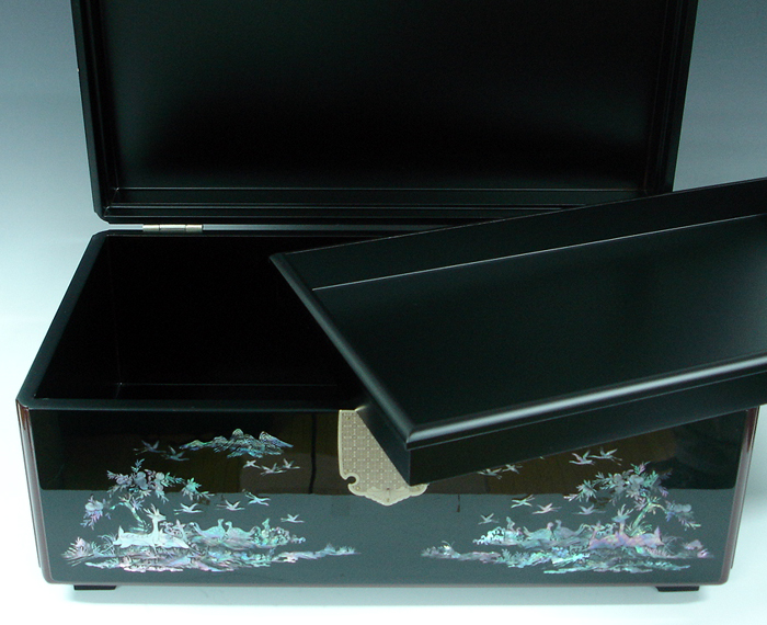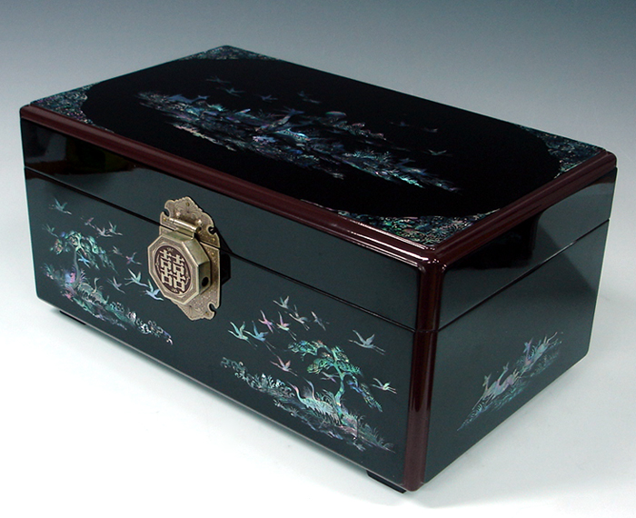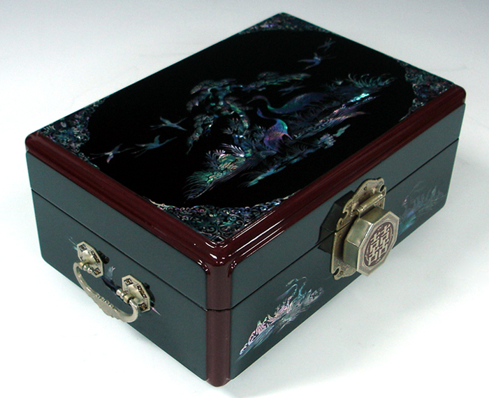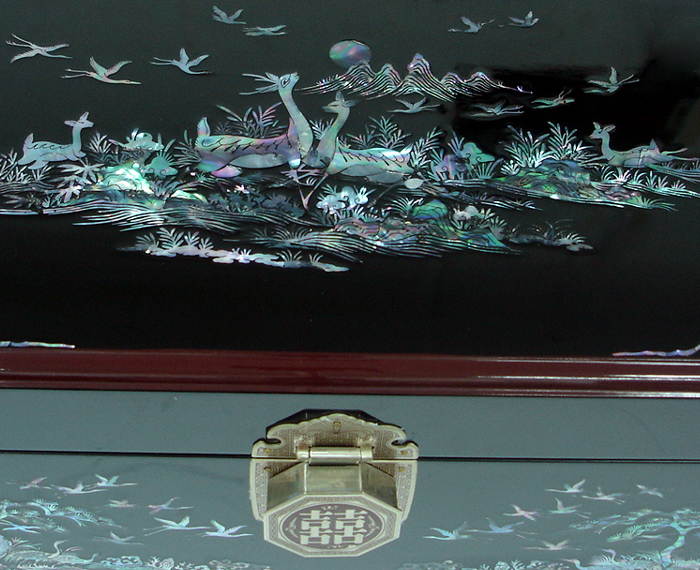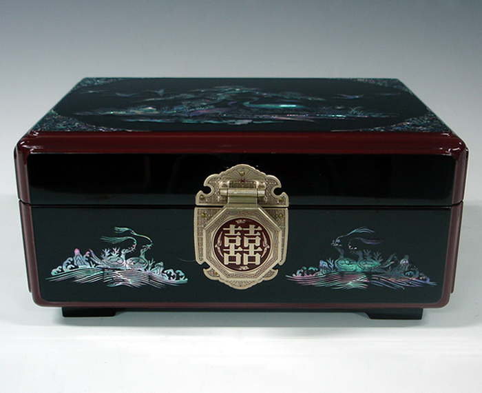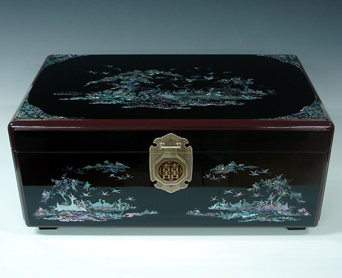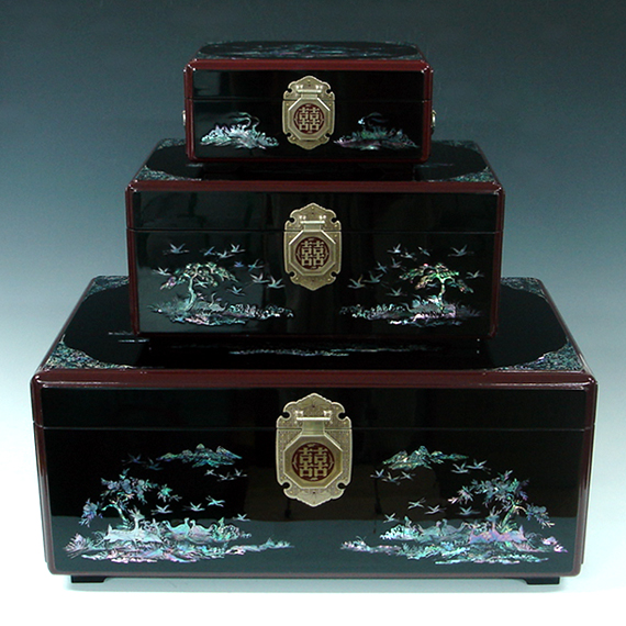 This exquisite Korean wooden wedding box (Ham) set is elegantly decorated with mother of pearl long life symbols design (Sipjangsaeng). The sipjangsaeng, 10 creatures that ancient Koreans, influenced by the Taoist philosophy, believed were created to enjoy eternal youth: sun, stone, water, cloud, pine tree, deer, bulnocho ('herb of eternal youth'), turtle, crane, and peach.