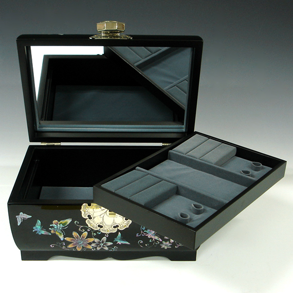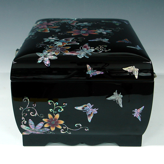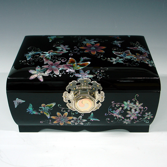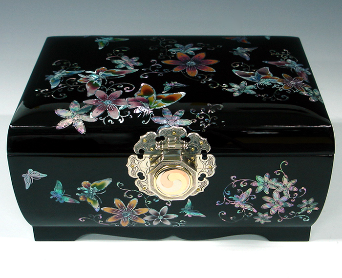 Unlike other lacquered wood jewelry box, this big jewellery box was created by traditional technique in which hemp cloth is laid upon the wood frame of the box called "skeleton" before repeated applying of natural lacquer. After lacquering, delicately designed mother of pearl pieces are individually inlaid by the artist. The specially handcrafted yin yang design knob made of cupro-nickel adds beautiful panache to this unique jewelry box. The elaborate adornment with the iridescence of intricate mother of pearl designs makes it an impressive item for collection.