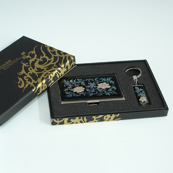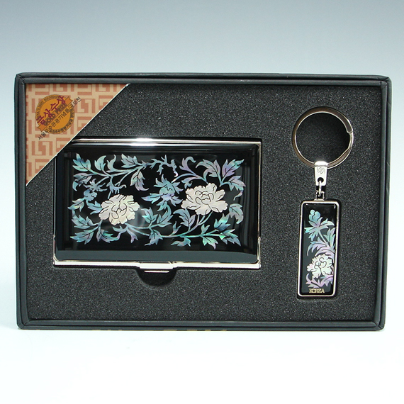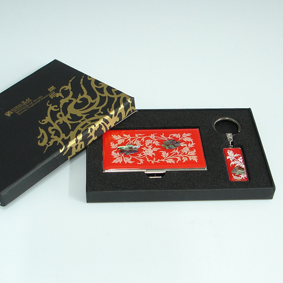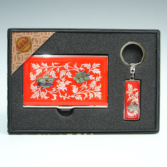 This unique mini business card holder and key chain gift set is elegantly ornamented with mother of pearl peony designs. Unlike other machine-cut printed mother of pearl designs, the mother of pearl designs on this unique mini business card holder and key chain, which are delicately jigsaw-cut by hands, are individually inlaid by our skilled artisan as shown in the large pictures. The arrangement of iridescent design's luster and color made of two different types of mother of pearl creates wonderful harmony with the black and red background, making it a remarkably attractive piece.