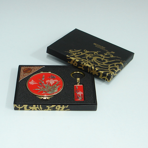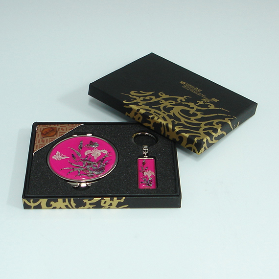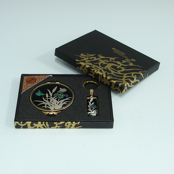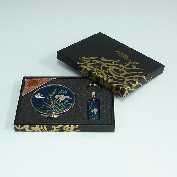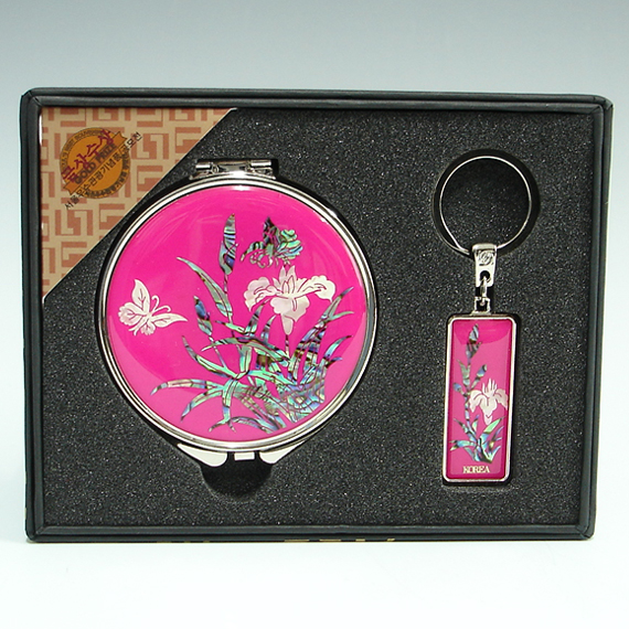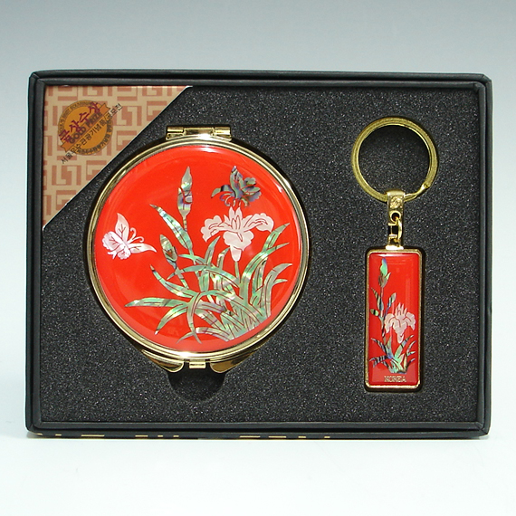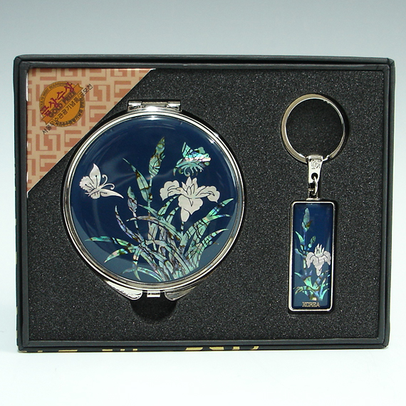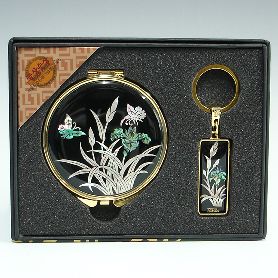 This unique gift set includes round hand mirror and matching key ring with beautifully inlaid mother of pearl orchid designs. Both the fully bloomed orchid blossoms and butterflies hovering over them are captured vividly, displaying the tradition of Korean crafts that favor adorning objects with idyllic natural scenes. The orchid, one of the "four noble beings" (sagunja), that emits a fragrant aroma in a deep valley, symbolizes a noble sage leading an austere life.