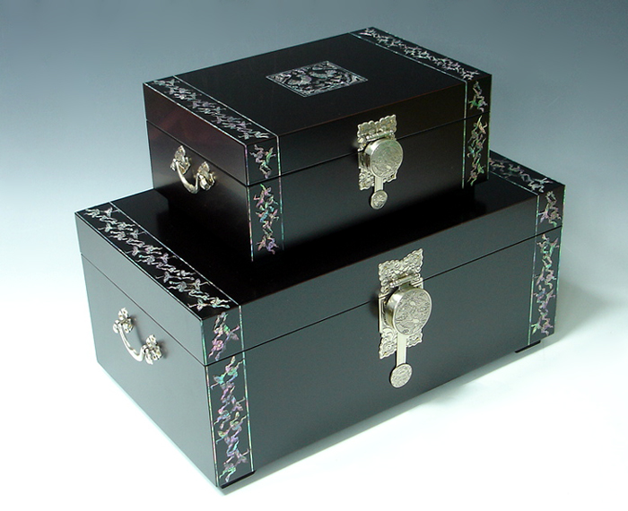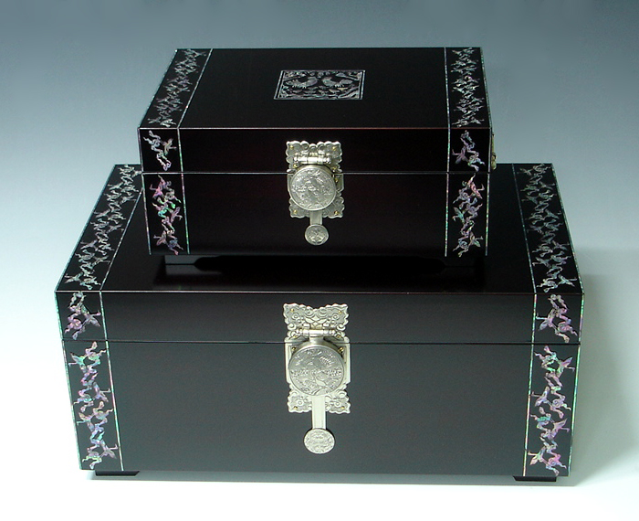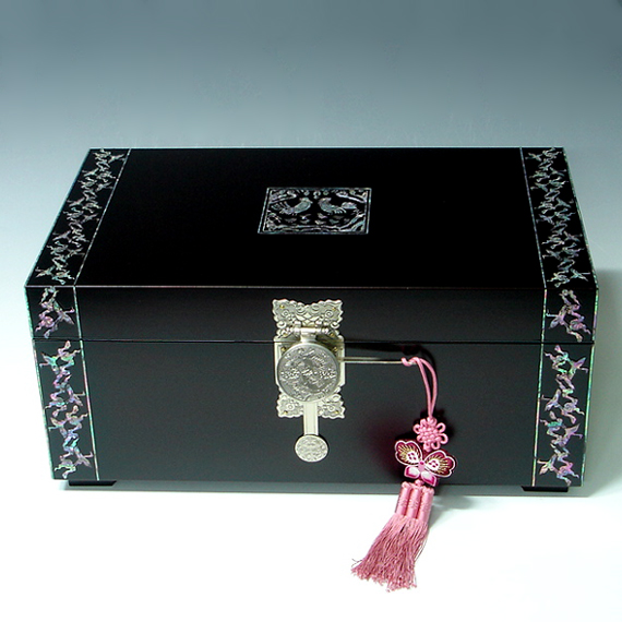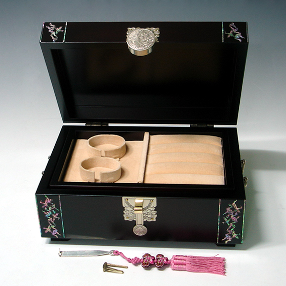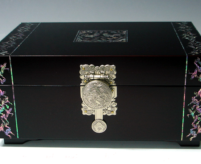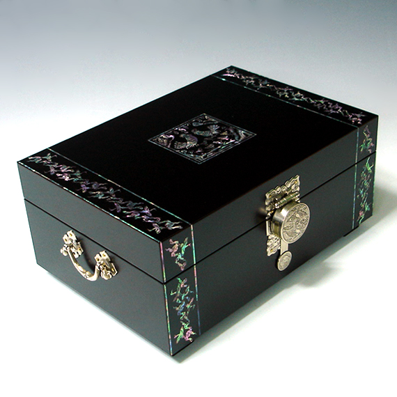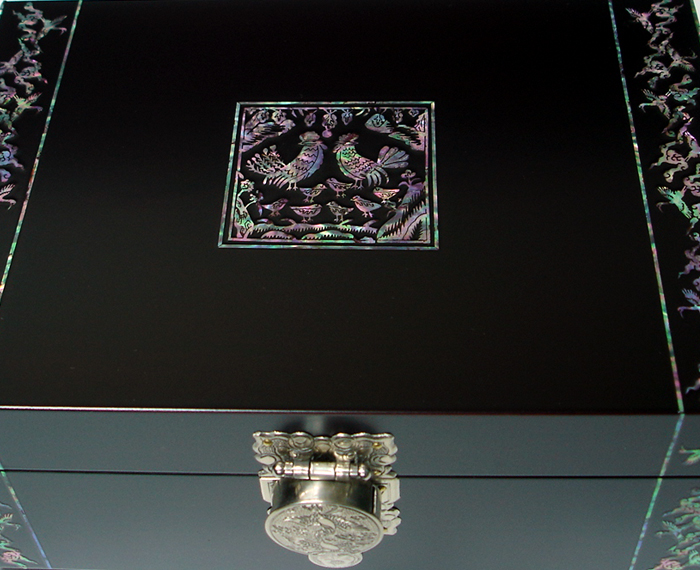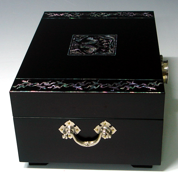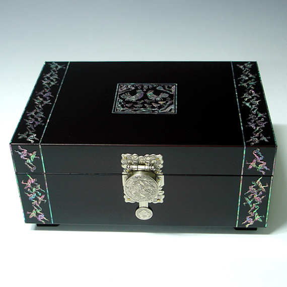 This exiquisite wood lacquer earring jewelry box made of Sabina chinensis that emits a fragrant aroma is elegantly decorated with mother of pearl design of phoenix. The harmony between the natural wooden surface and the iridescence of the mother of pearl design makes it a memorable item for any collection. The phoenix, along with the dragon, is the symbol of an emperor and is believed to herald a time of peace and prosperity.