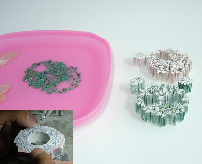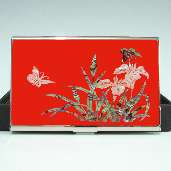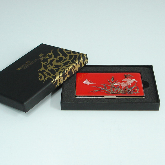 Unlike other machine-cut printed mother of pearl designs, the mother of pearl designs on this unique custom business card holder, which are delicately jigsaw-cut by hands, are individually inlaid by our skilled artisan as shown in the large pictures. The arrangement of iridescent design's luster and color made of two different types of mother of pearl creates wonderful harmony with the red background, making it a remarkably attractive piece.