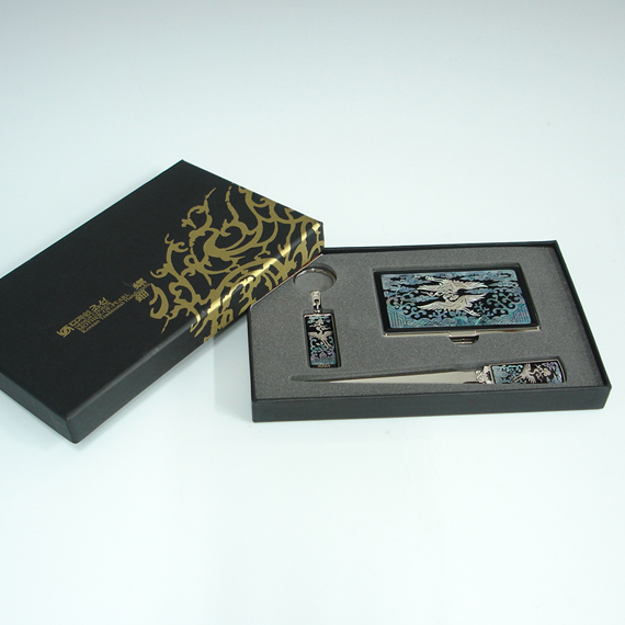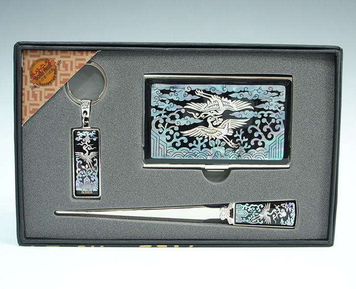 This unique gift set includes key ring, business card case and letter opener with beautifully inlaid mother of pearl crane and cloud designs. Unlike other machine-cut printed mother of pearl designs, the mother of pearl designs on this set, which are delicately jigsaw-cut by hands, are individually inlaid by our skilled artisan as shown in the large pictures. The arrangement of iridescent design's luster and color made of two different types of mother of pearl creates wonderful harmony with the black background, making it a remarkably attractive piece.