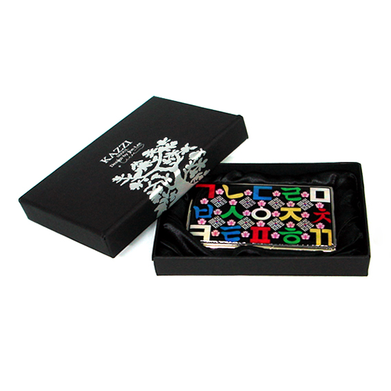 This unique mother of pearl ladies credit card holder is ornamented with a mother of pearl design of Korean alphabet, four trigrams and Rose of Sharon. The arrangement of intricate design's iridescence and color of mother of pearl creates wonderful harmony with the black background, making it a remarkably attractive piece. The engraved geometric patterns on the back add beautiful panache to this credit card holder.