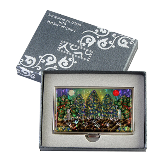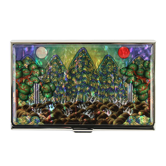 This unique credit card holder wallet is ornamented with mother of pearl design of sun and moon painting which was painted on the screen placed at the back of king's seat in Korean royal palaces. The arrangement of intricate design's iridescence and color of mother of pearl makes it a remarkably attractive piece. The embossed lattice pattern on the backside and inside surface, which helps prevent slipping, adds beautiful panache to this card holder wallet.
