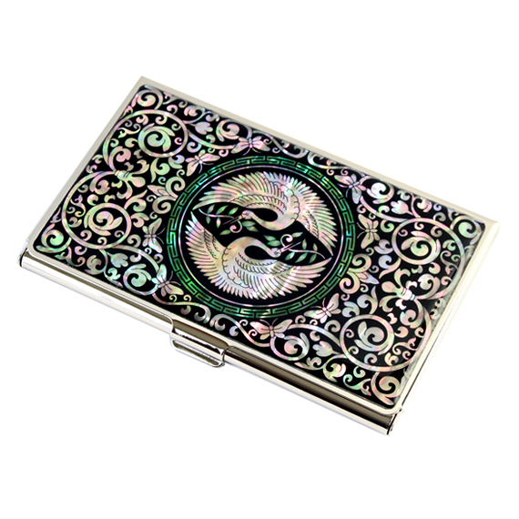 Custom Business Card Holder with Mother of Pearl Double Crane Design