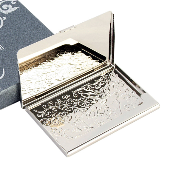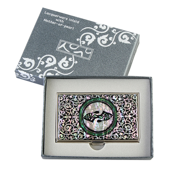 This unique custom business card holder is ornamented with an intricate mother of pearl design of double crane representing eternity. The elaborate adornment with the iridescence of mother of pearl designs makes it an impressive item for collection. The embossed pattern on the backside and inside surface, which helps prevent slipping, adds beautiful panache to this card holder. Read More