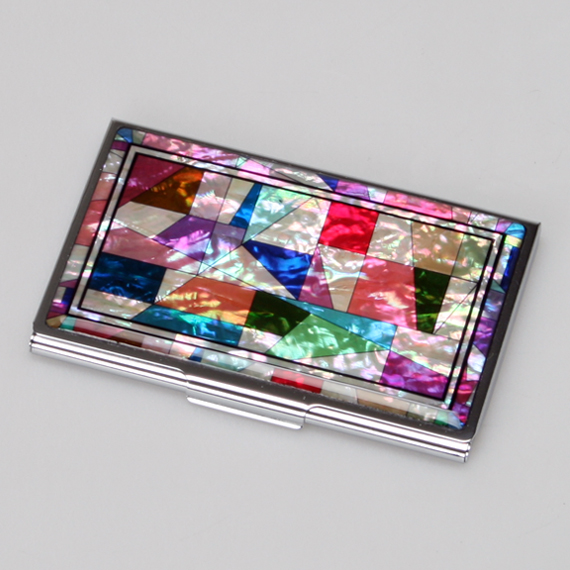 This unique mother of pearl slim credit card holder is decorated with the simple reinterpretation of chogakbo design. Chogakbo is the patchwork wrapping cloth that Korean housewives made with leftover pieces of fabric. Chogakbo is appraised by art critics as a fine art with its refined composition and harmonious color combination from different leftover cloth pieces, even though the tradition of chogakbo making began because of practical uses in the home; for example, it was used as a screen as well as a wrapper for clothes, bedding or gifts. It has found another wonderful use in this card case.