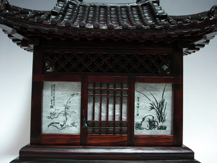This unique wood lamp shade features a structure of Hanok, traditional Korean house. When the light is on, each side reveals the design of Sagunja, or "four noble beings," containing four plants, maehwa (spring), orchid (summer), chrysanthemum (autumn) and bamboo (winter) that symbolize the four seasons. There is a pull string switch on the lamp so that the user can choose from two colors of light. This wood lamp radiates soft and comforting natural light to soothe the body and mind, tired from busy urban life.