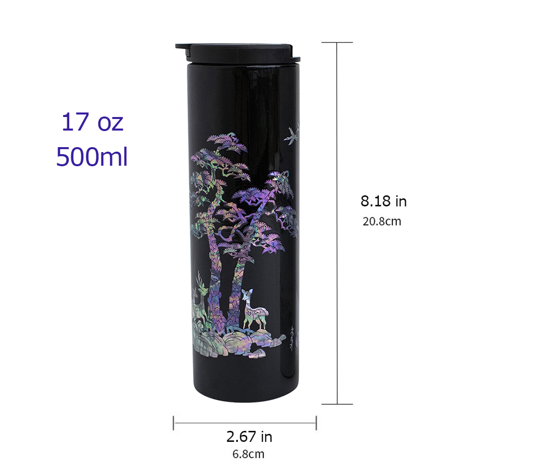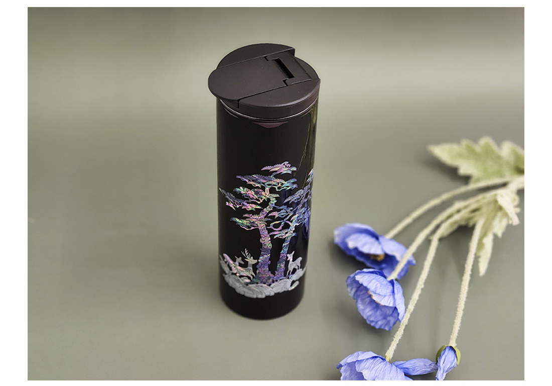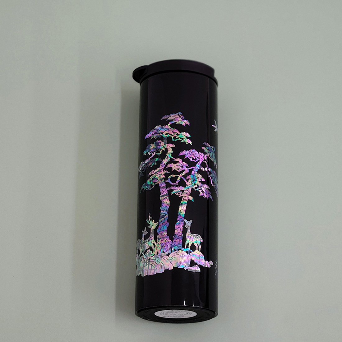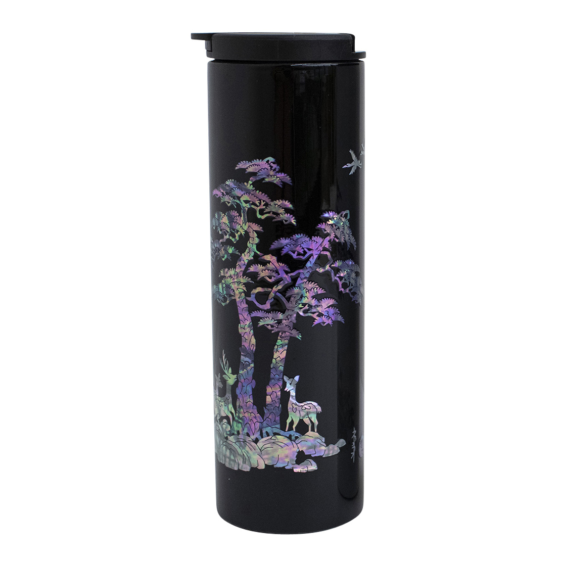 The mother of pearl design with a modern touch embellishes the body of this water bottle. The unique Korean mother of pearl inlaying technique developed over a millennium ago complements this modern object wonderfully.
