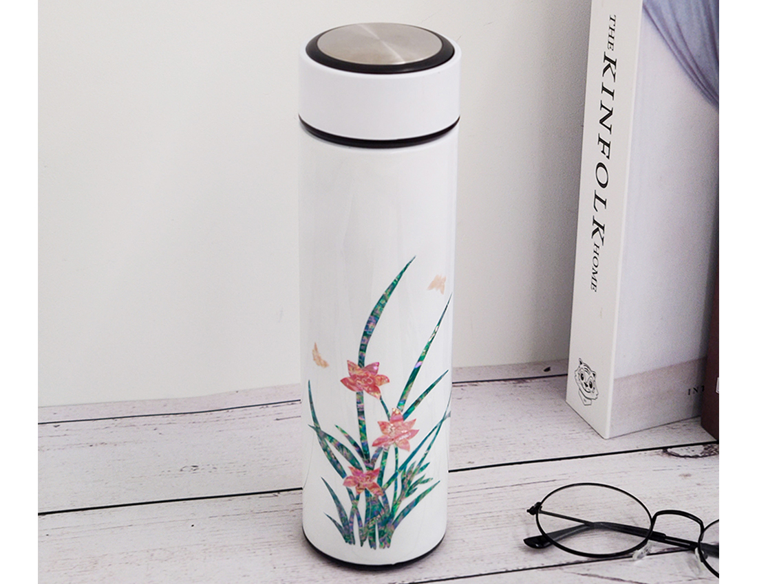 The mother of pearl design with a modern touch embellishes the body of this water bottle. The unique Korean mother of pearl inlaying technique developed over a millennium ago complements this modern object wonderfully.