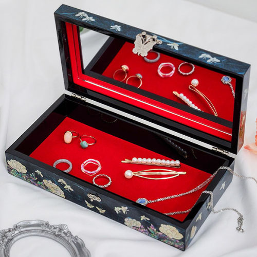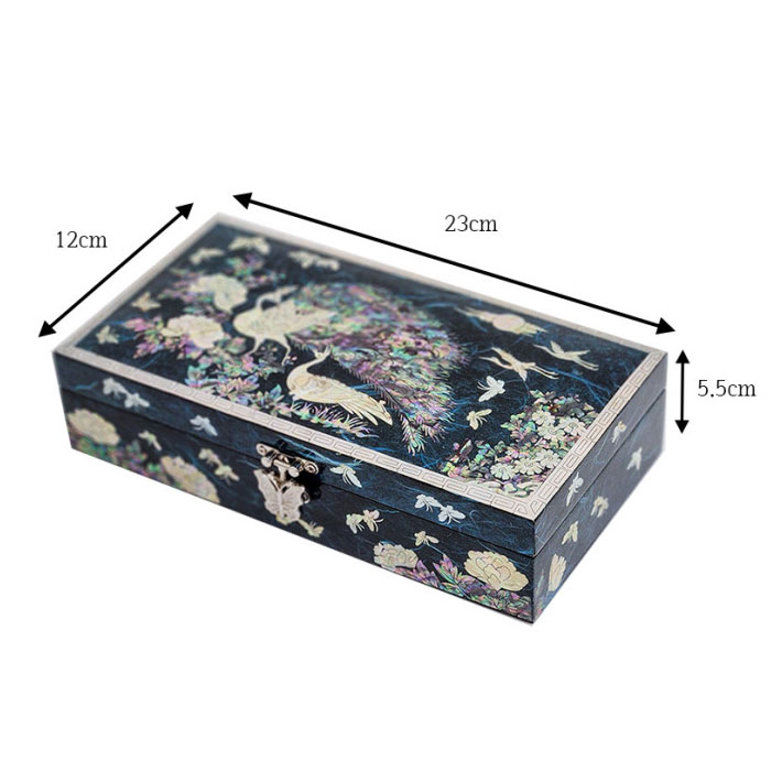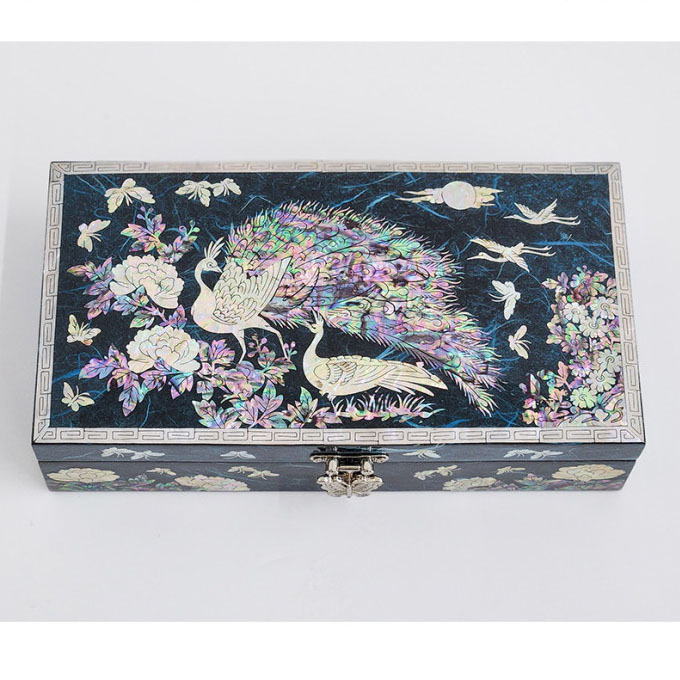 This wooden jewelry case is elegantly embellished with mother of pearl design of a pair of peacock with fully-opened tail delighting in a romantic moment wrought by the intricate mother of pearl inlaying technique. The harmony between the colored Korean mulberry paper and the iridescence of the mother of pearl design makes it a memorable item for any collection.