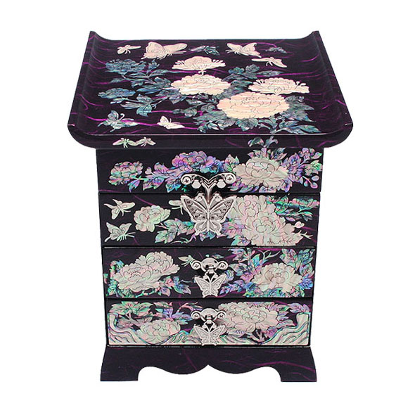 This handcrafted jewelry wooden box is elegantly decorated with mother of pearl design of peony flower. The fully open peony blossom is a symbol of wealth and nobility. The harmony between the colored Korean mulberry paper and the iridescence of the mother of pearl design makes it a memorable item for any collection.