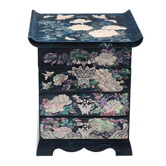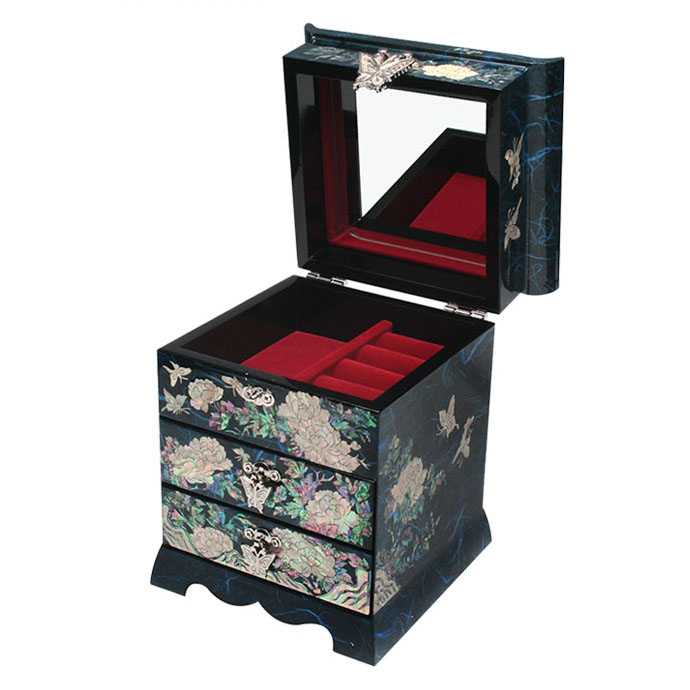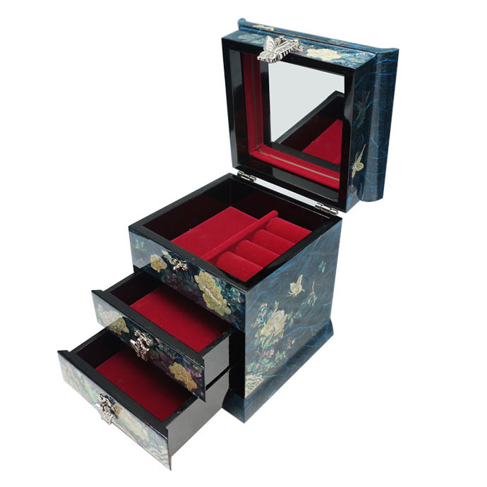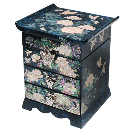 Mother of Pearl Inlay Blue Wood Drawer Jewelry Box with Peony Design