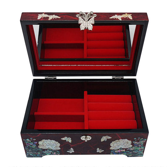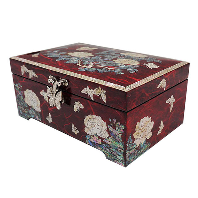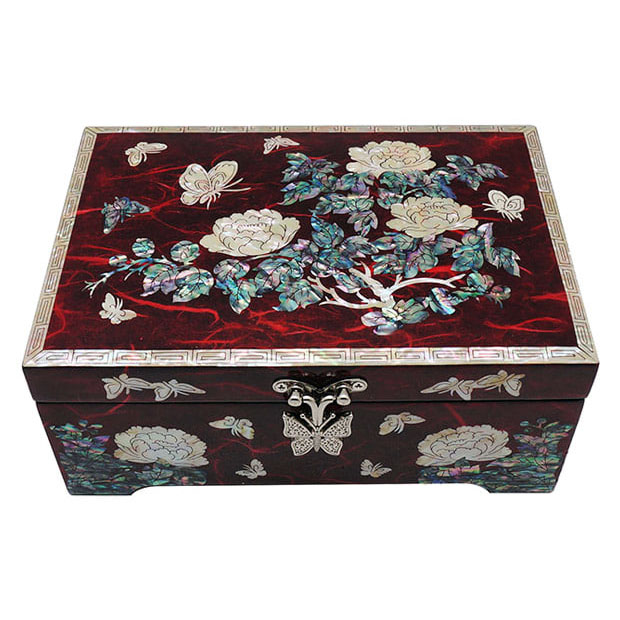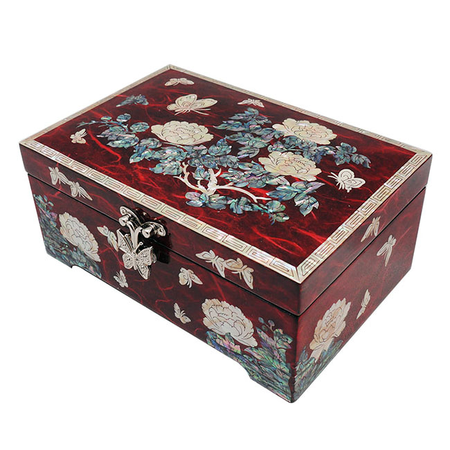 Mother of Pearl Jewelry Wood Box with Inlaid Red Peony Design