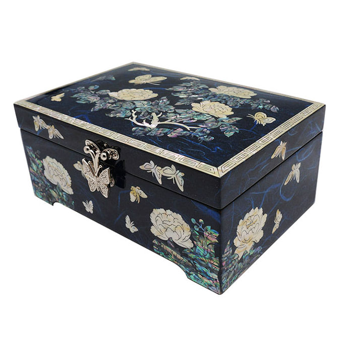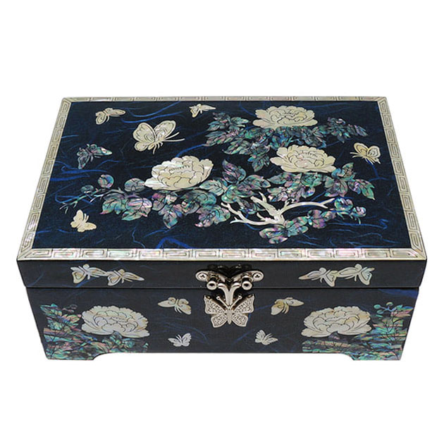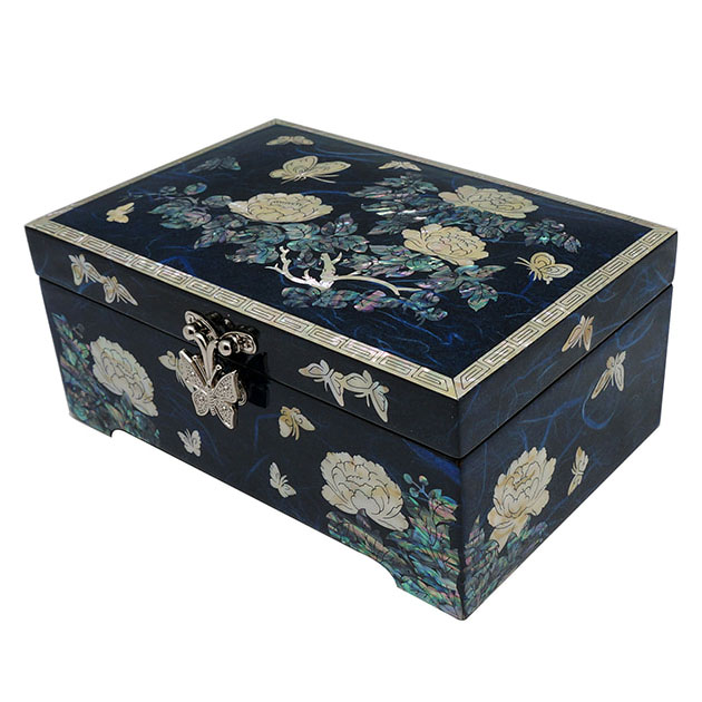 Mother of Pearl Jewelry Wood Box with Inlaid Blue Peony Design