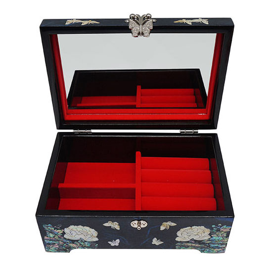 This handcrafted jewelry wooden box is elegantly decorated with mother of pearl design of peony flower. The fully open peony blossom is a symbol of wealth and nobility. The elaborate adornment with the iridescence of intricate mother of pearl designs makes it an impressive item for collection.