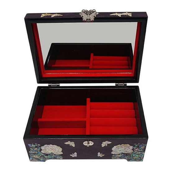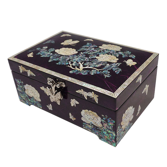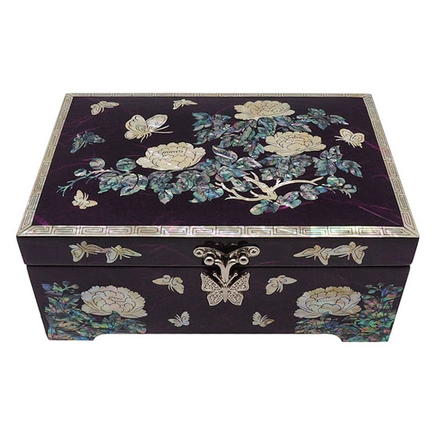 Mother of Pearl Jewelry Wood Box with Inlaid Purple Peony Design