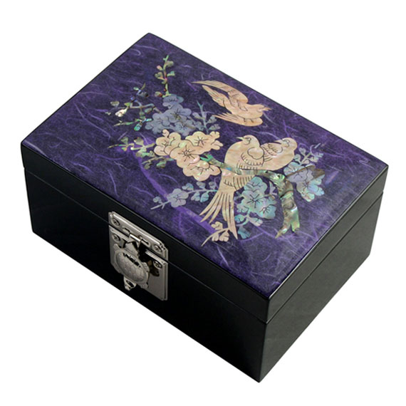 This wooden trinket box is elegantly embellished with mother of pearl design of birds perched on a branch for a rest wrought by the intricate mother of pearl inlaying technique. The harmony between the colored Korean mulberry paper and the iridescence of the mother of pearl design makes it a memorable item for any collection.