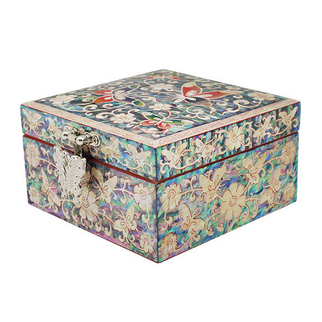 The luxury pirate jewelry treasure chest box is lavishly ornamented with mother of pearl butterfly. The butterfly, a symbol of free love and happiness that has been used to decorate ladies' fashion or home accessories, is redesigned for this unique jewelry box. The inner surface is also ornamented with colorful raw mother of pearl pieces, giving the beautiful panache to this wood jewelry box. The elaborate adornment with the iridescence of intricate mother of pearl designs makes it a breathtaking piece for storing personal fashion items.