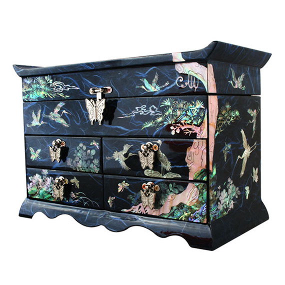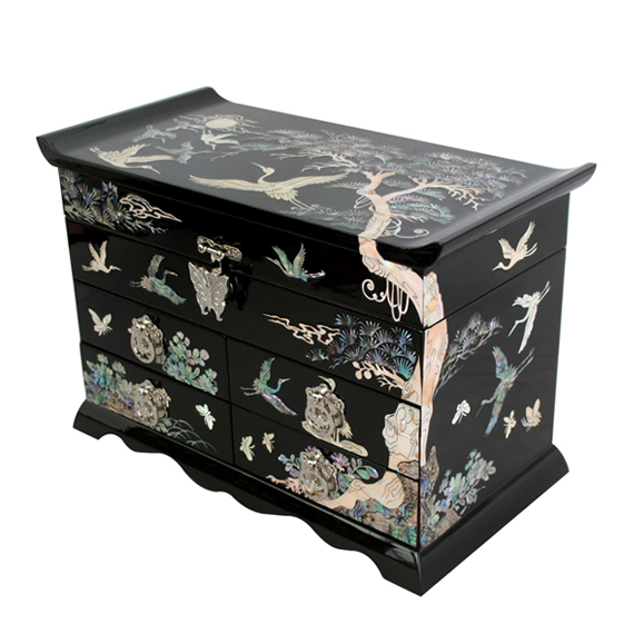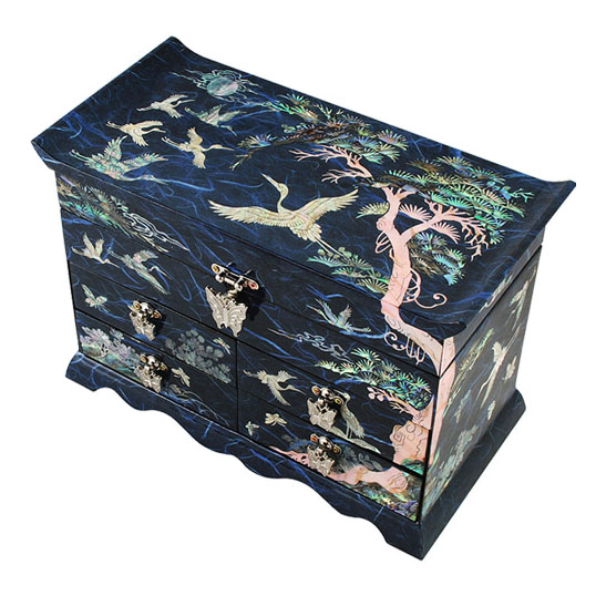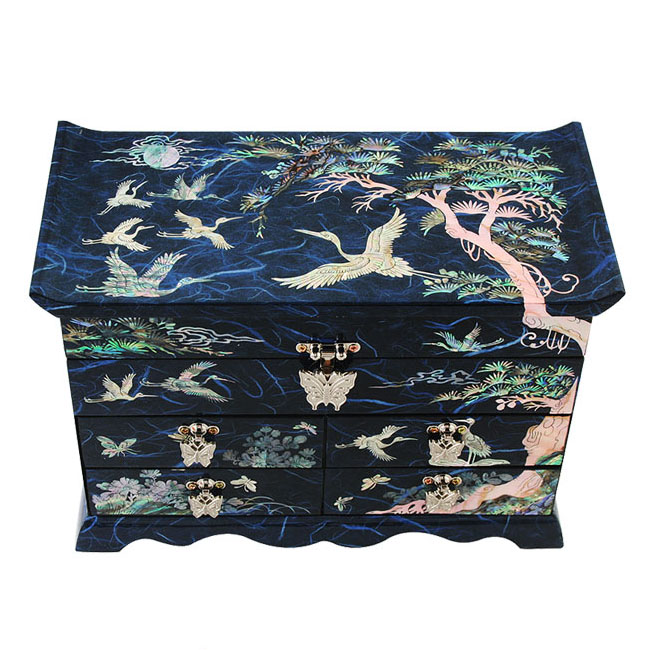 This wooden jewelry boxes chest depicts a serene image of cranes delighting in an idyllic moment under an old pine tree, a symbol of elevated consciousness and dignified spirit. The harmony between the colored Korean mulberry paper and the iridescence of the mother of pearl design makes it a memorable item for any collection.