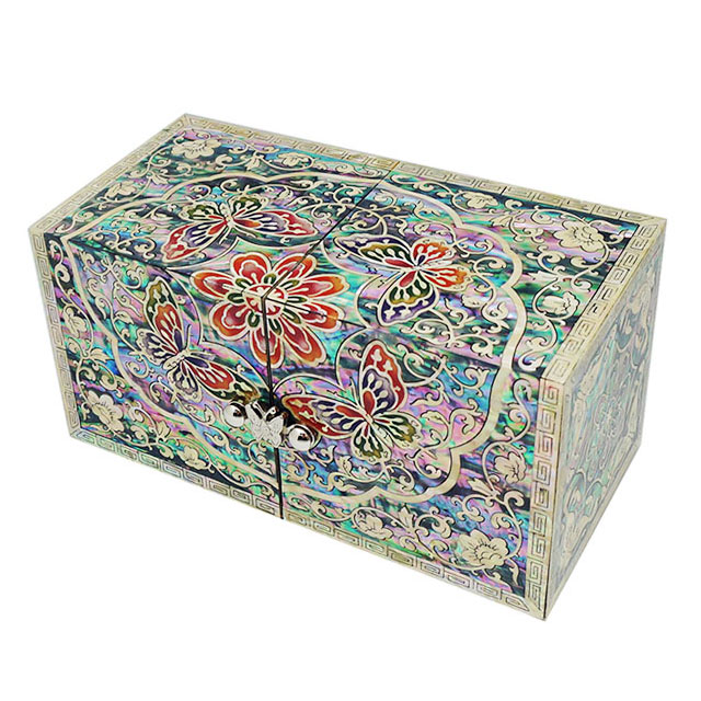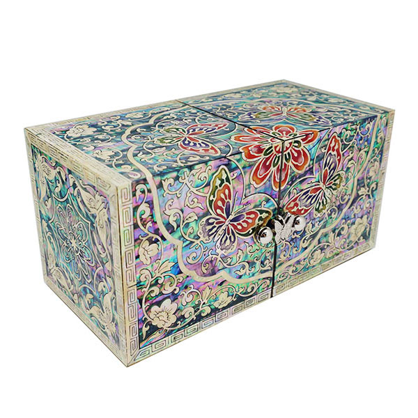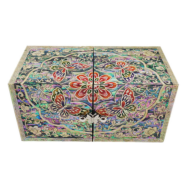 The luxury secret jewelry box is lavishly ornamented with mother of pearl butterfly and arabesque. The butterfly, a symbol of free love and happiness that has been used to decorate ladies' fashion or home accessories, is redesigned for this unique jewelry box. The elaborate adornment with the iridescence of intricate mother of pearl designs makes it a breathtaking piece for storing personal fashion items.