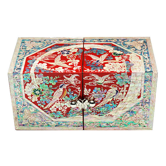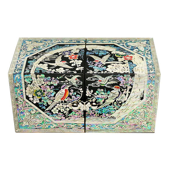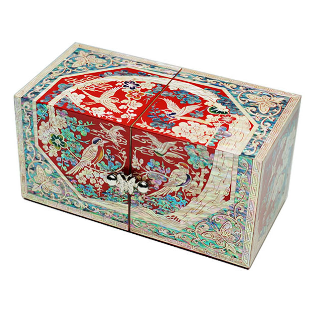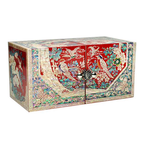 The luxury secret jewelry box is lavishly ornamented with mother of pearl bird and flower. The elaborate adornment with the iridescence of intricate mother of pearl designs makes it a breathtaking piece for storing personal fashion items.