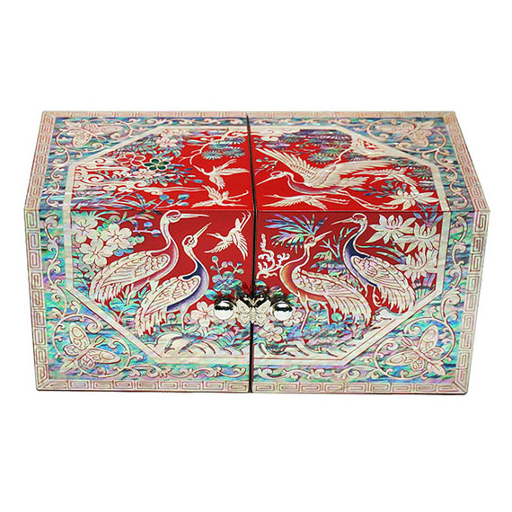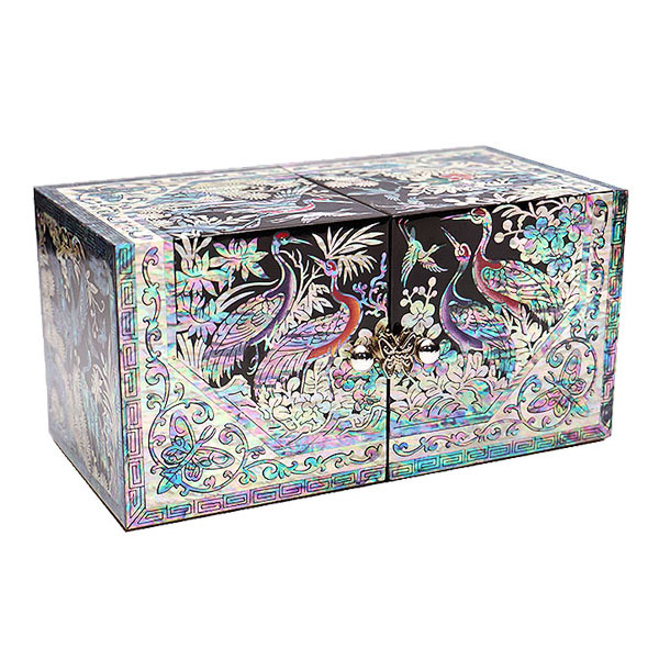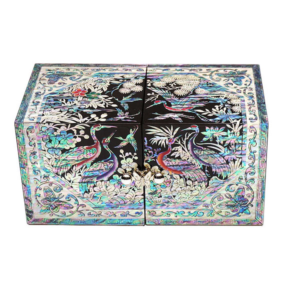 The luxury secret jewelry box is lavishly ornamented with mother of pearl cranes delighting in an idyllic moment in the flowers. The elaborate adornment with the iridescence of intricate mother of pearl designs makes it an impressive item for collection.