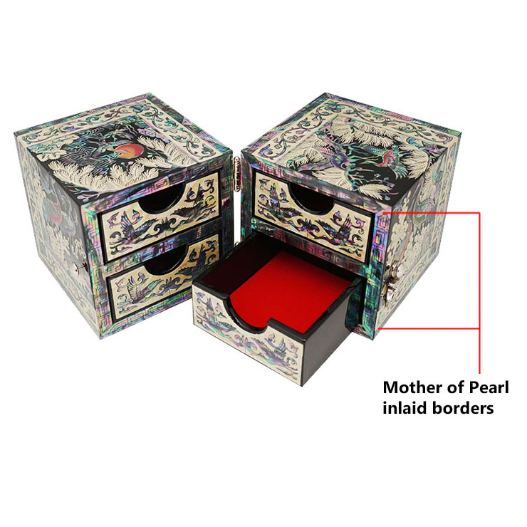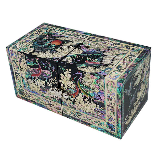 Mother of Pearl Twin Cubic Secret Jewelry Box with Crane Pine Tree