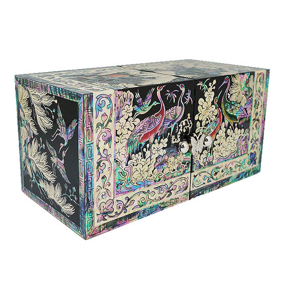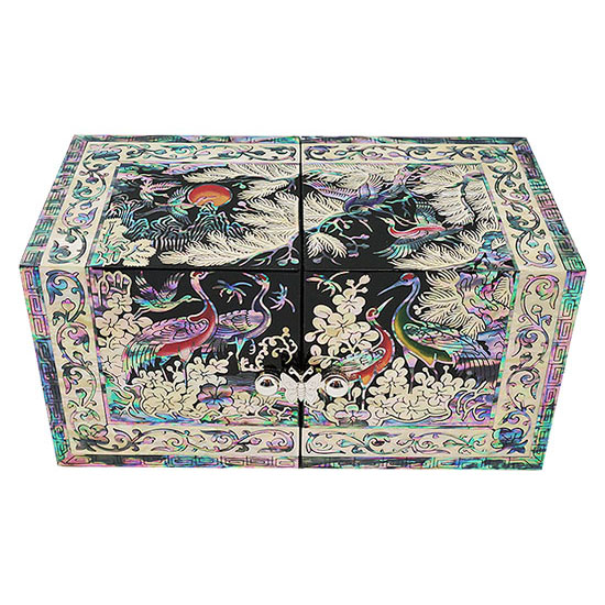The luxury secret jewelry box depicts a serene image of cranes delighting in an idyllic moment under an old pine tree, a symbol of elevated consciousness and dignified spirit. The elaborate adornment with the iridescence of intricate mother of pearl designs makes it a breathtaking piece for storing personal fashion items.