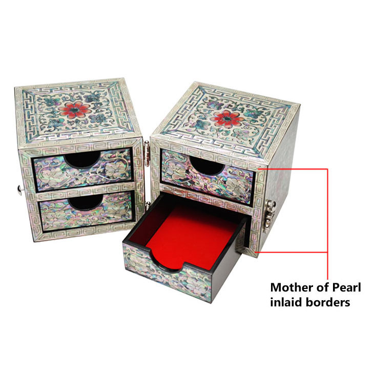 The luxury secret jewelry box is lavishly ornamented with mother of pearl arabesque flower. The elaborate adornment with the iridescence of intricate mother of pearl designs makes it an impressive item for collection.