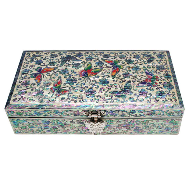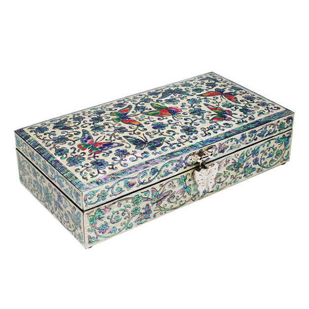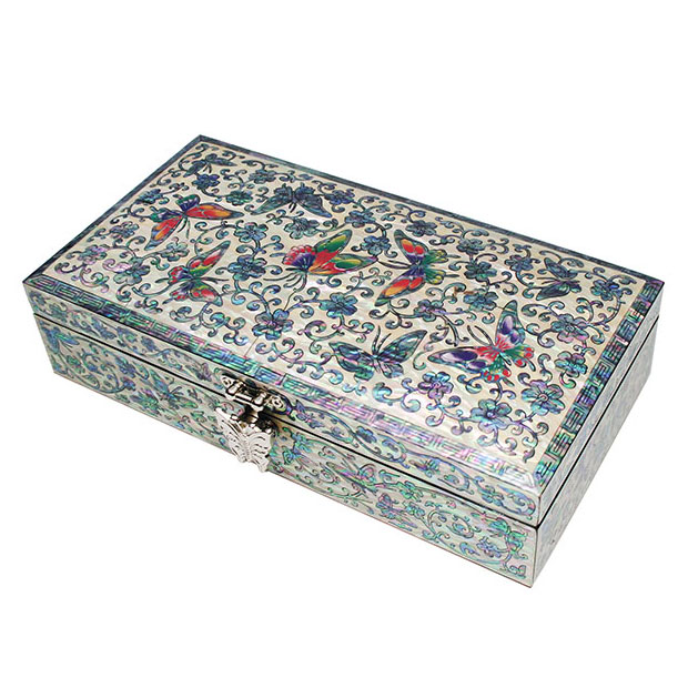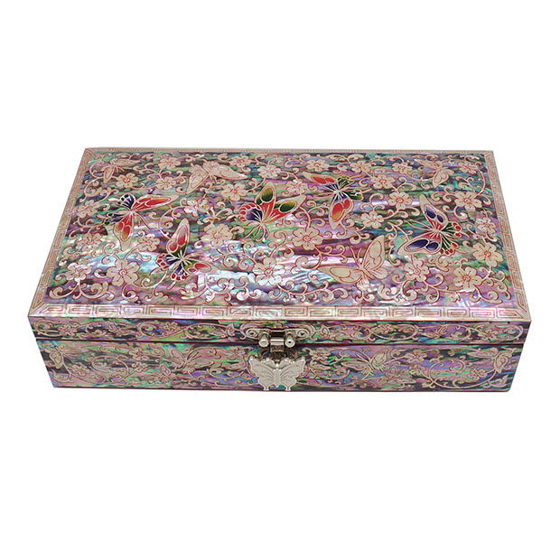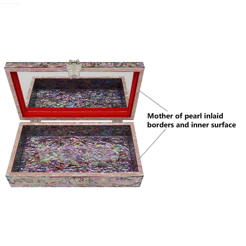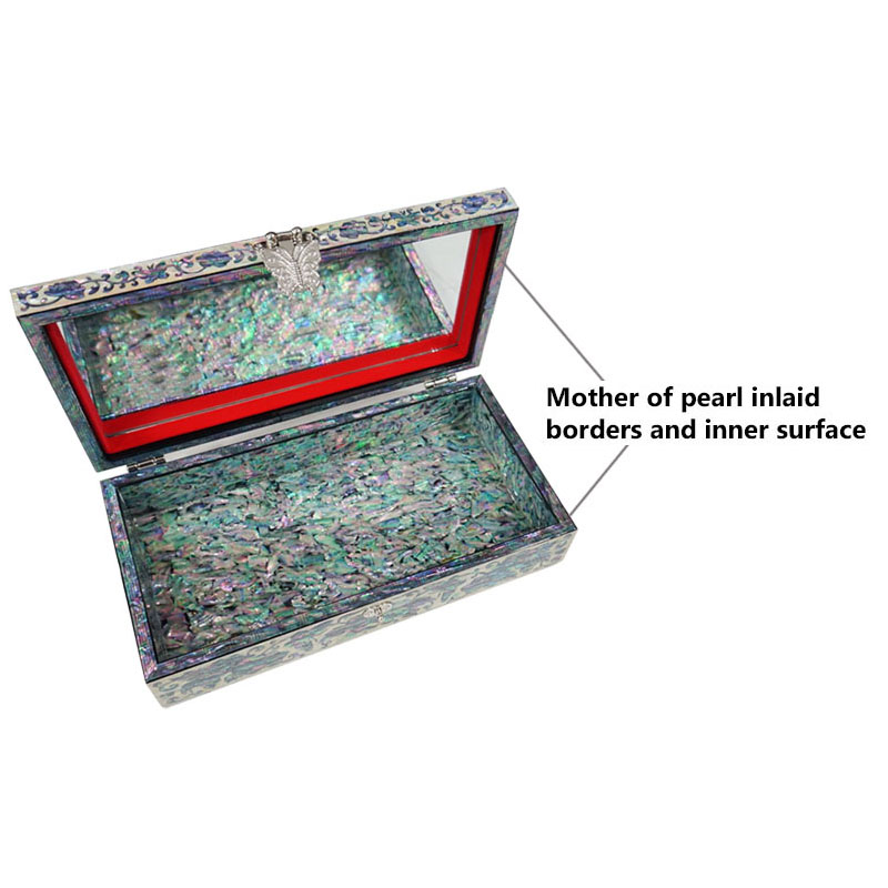The luxury jewelry box case is lavishly ornamented with mother of pearl butterfly and flower. The butterfly, a symbol of free love and happiness that has been used to decorate ladies' fashion or home accessories, is redesigned for this unique jewelry box. The elaborate adornment with the iridescence of intricate mother of pearl designs makes it a breathtaking piece for storing personal fashion items. The inner surface is also ornamented with colorful raw mother of pearl pieces, giving the beautiful panache to this wood jewelry box.