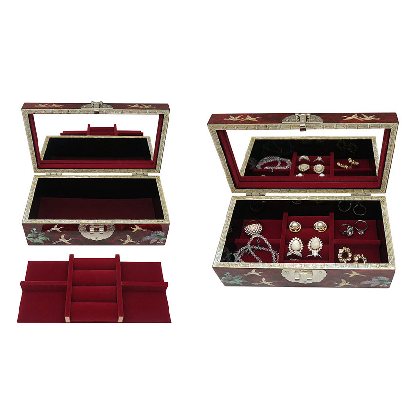 The jewelry box depicts a serene image of cranes delighting in an idyllic moment on an old pine tree, a symbol of elevated consciousness and dignified spirit. The elaborate adornment with the iridescence of intricate mother of pearl designs makes it a breathtaking piece for storing personal fashion items.
