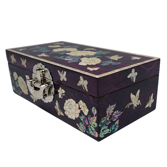 The lock jewelry box is elegantly ornamented with mother of pearl peony flower. The fully open peony blossom is a symbol of wealth and nobility. The elaborate adornment with the iridescence of intricate mother of pearl designs makes it a breathtaking piece for storing personal fashion items.