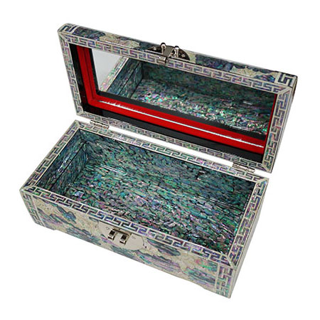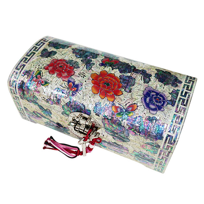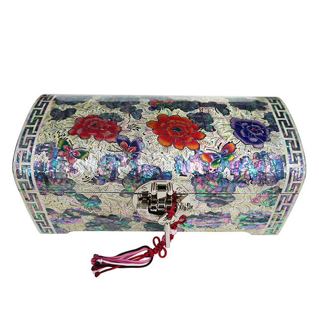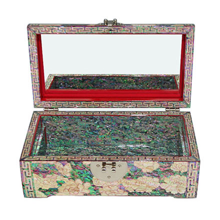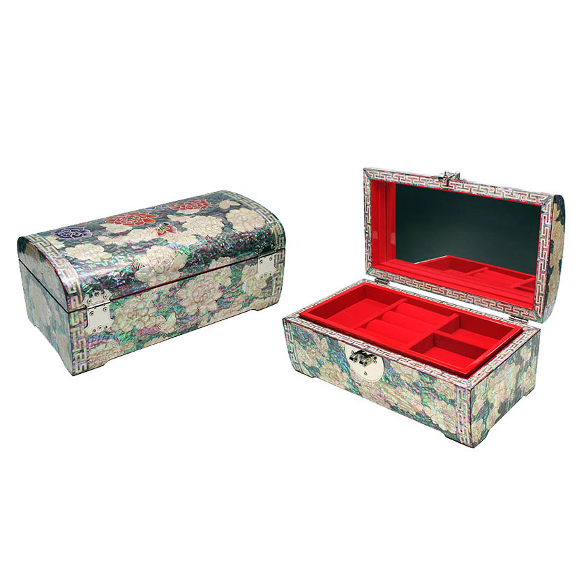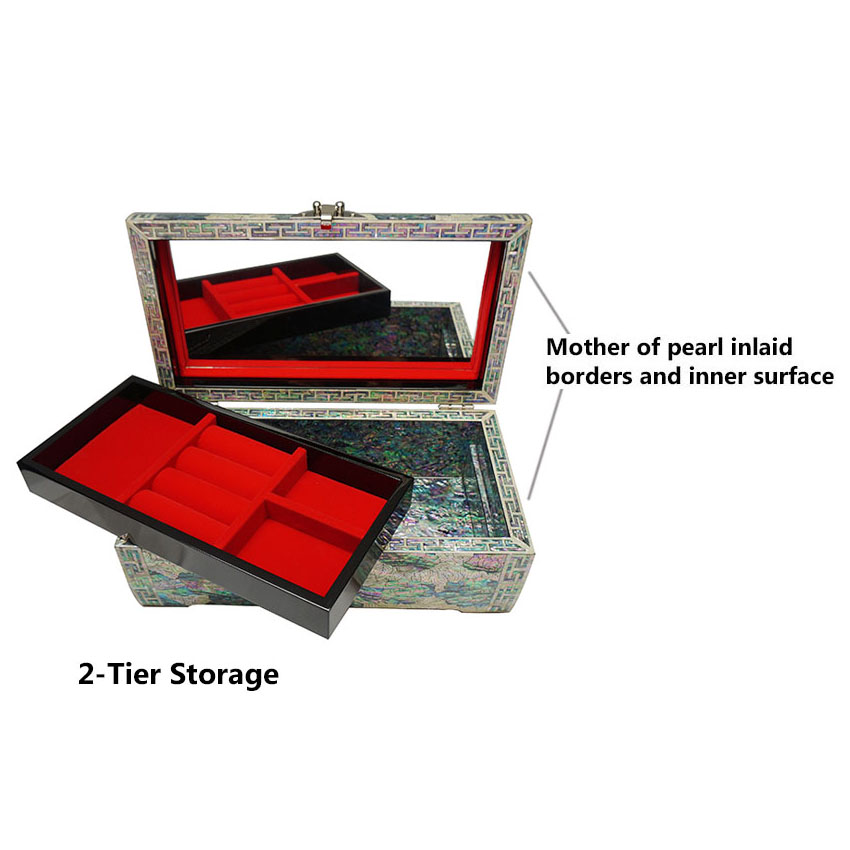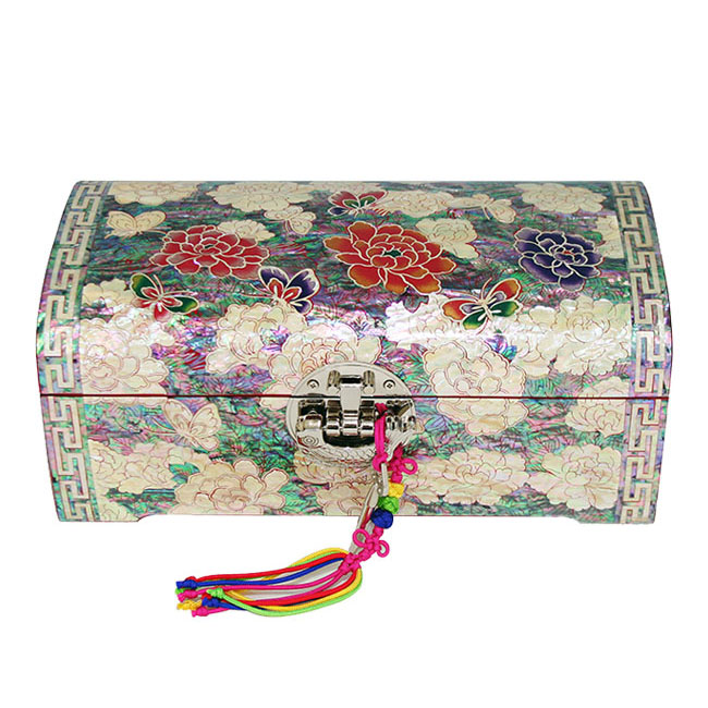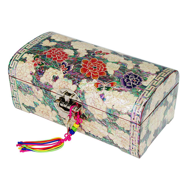 The 2-tier lock jewelry box is elegantly ornamented with mother of pearl peony flower. The fully open peony blossom is a symbol of wealth and nobility. The elaborate adornment with the iridescence of intricate mother of pearl designs makes it a breathtaking piece for storing personal fashion items.