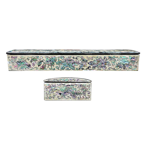 The elaborate adornment with the iridescence of mother of pearl designs makes it an impressive item for collection. The inner surface is also ornamented with colorful raw mother of pearl pieces, giving the beautiful panache to this wood pen holder.