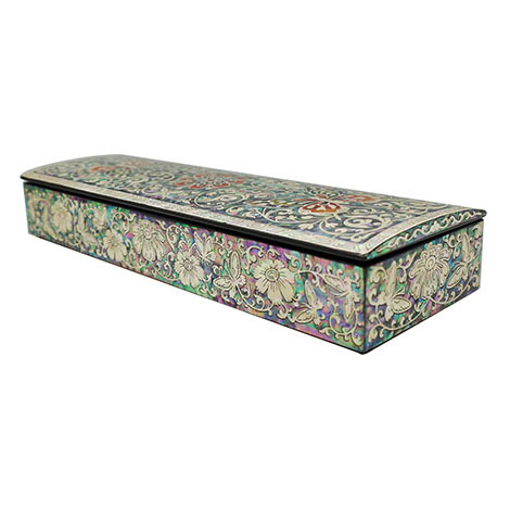 This unique pen holder is ornamented with an intricate mother of pearl arabesque and butterfly. The elaborate adornment with the iridescence of mother of pearl designs makes it an impressive item for collection. The inner surface is also ornamented with colorful raw mother of pearl pieces, giving the beautiful panache to this wood pen holder.
