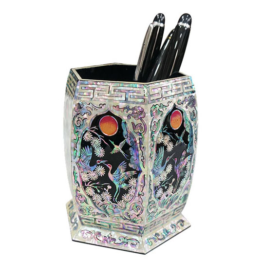 This unique pen holder depicts a serene image of cranes delighting in an idyllic moment under a full moon. The elaborate adornment with the iridescence of mother of pearl designs makes it an impressive item for collection.