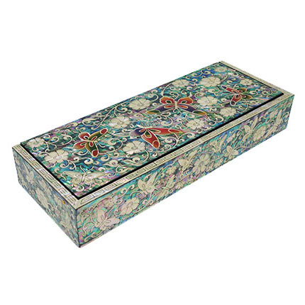 This unique pen holder is ornamented with mother of pearl butterfly and flower. The butterfly, a symbol of free love and happiness that has been used to decorate ladies' fashion or home accessories, is redesigned for this unique pen holder. The elaborate adornment with the iridescence of intricate mother of pearl designs makes it an impressive piece for storing personal fashion items.
