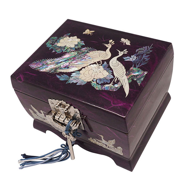 Mother of Pearl Music Jewelry Box Inlaid with Purple Wood Peacock Design