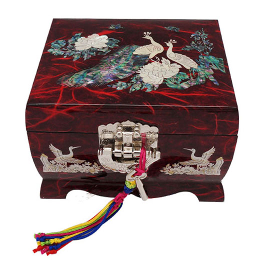 This wooden music jewelry box is elegantly embellished with mother of pearl design of a pair of peacock with fully-opened tail delighting in a romantic moment on a tree wrought by the intricate mother of pearl inlaying technique. The elaborate adornment with the iridescence of intricate mother of pearl designs makes it an impressive item for collection.