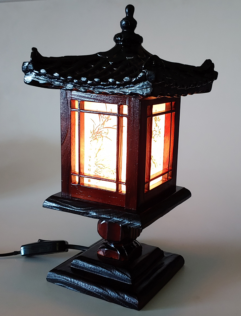 Wood Bedside Lamp with Traditional Korean Pavilion Design