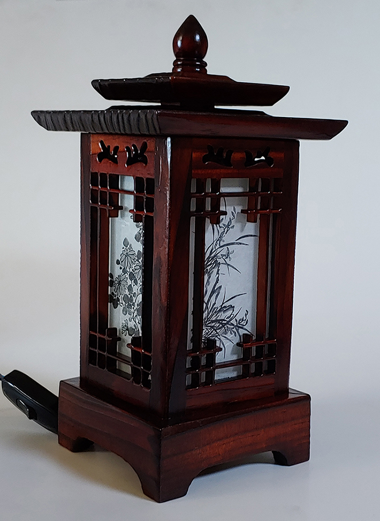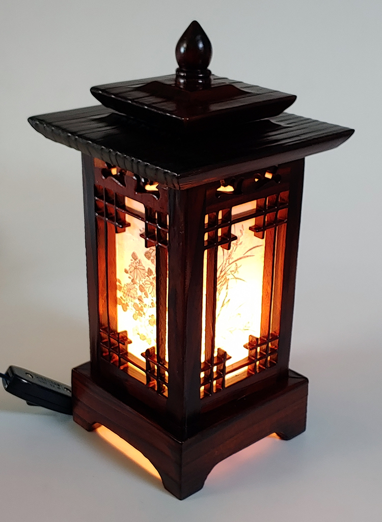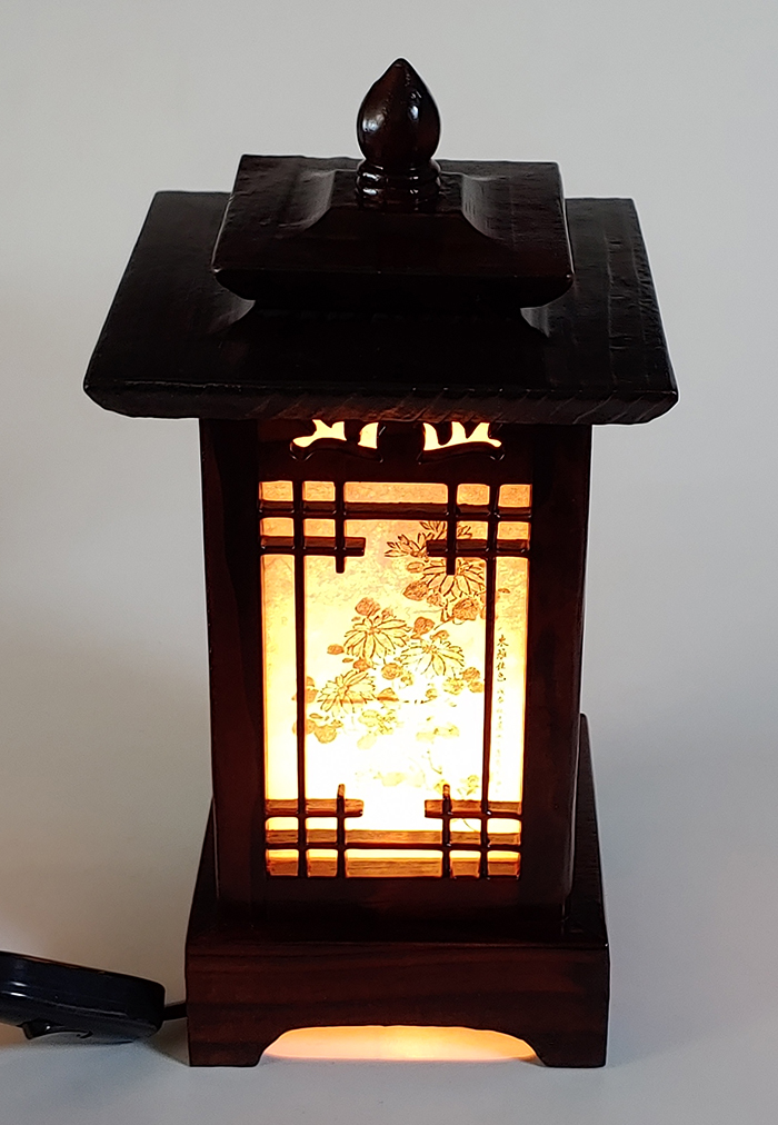 This unique carved wood table lamp features a structure consisting of traditional Korean pagoda and windows. When the light is on, each side reveals the design of Sagunja, or "four noble beings," containing four plants, maehwa (spring), orchid (summer), chrysanthemum (autumn) and bamboo (winter) that symbolize the four seasons. There is a pull string switch on the lamp so that the user can choose from two colors of light. This wood lamp radiates soft and comforting natural light to soothe the body and mind, tired from busy urban life.