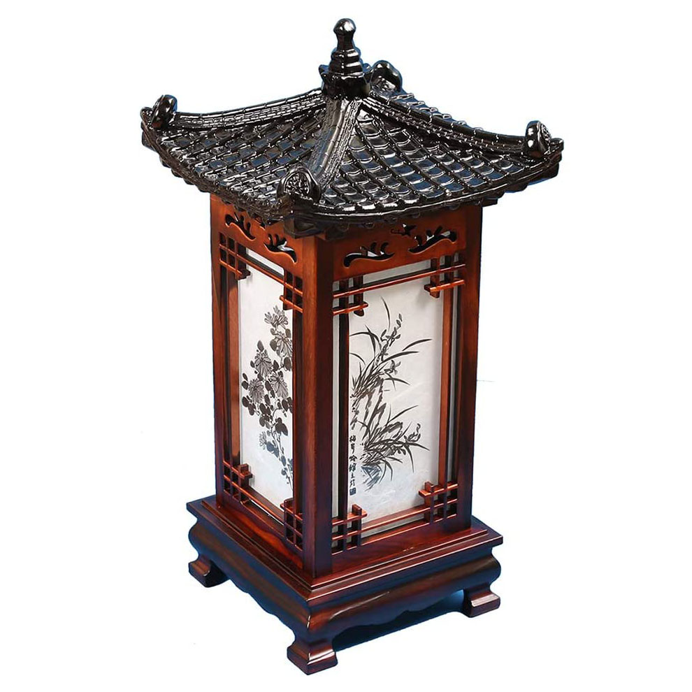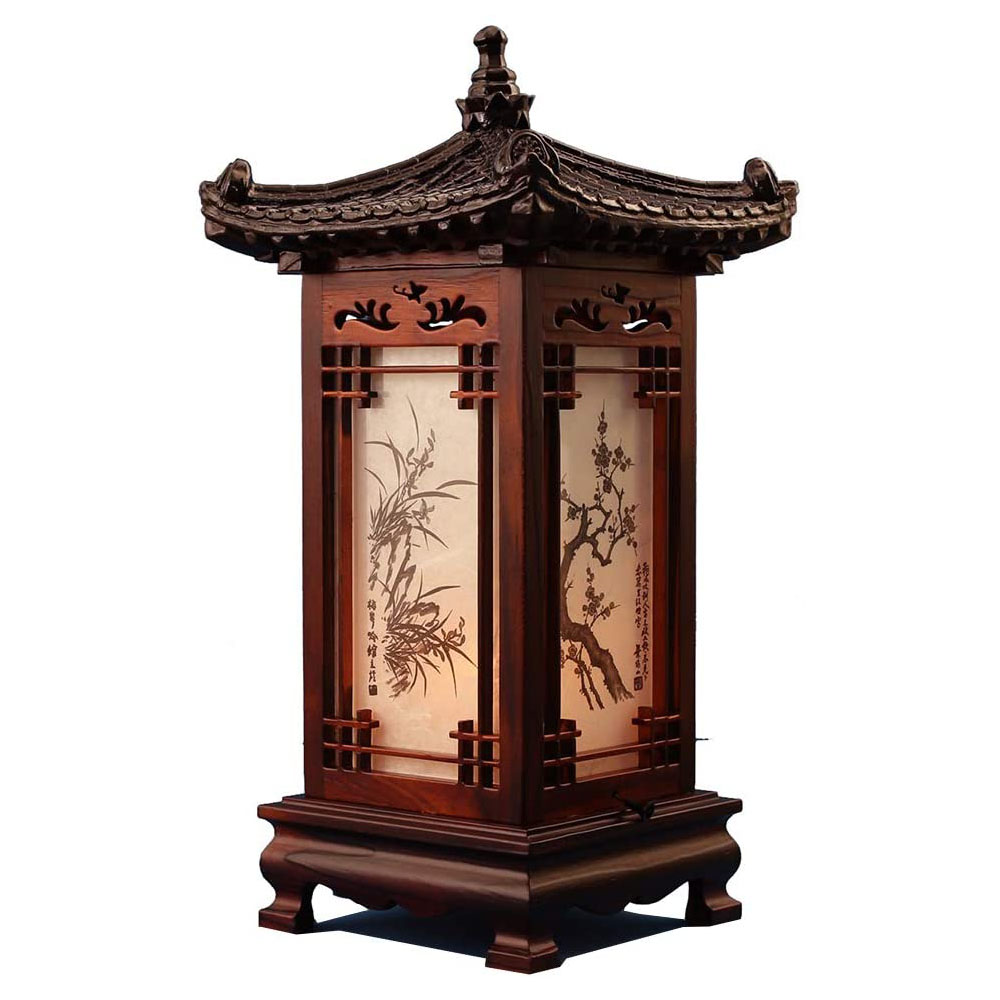 This unique carved wood table lamp features a structure consisting of traditional Korean house dragon roof and windows. When the light is on, each side reveals the design of Sagunja, or "four noble beings," containing four plants, maehwa (spring), orchid (summer), chrysanthemum (autumn) and bamboo (winter) that symbolize the four seasons. There is a pull string switch on the lamp so that the user can choose from two colors of light. This wood lamp radiates soft and comforting natural light to soothe the body and mind, tired from busy urban life.