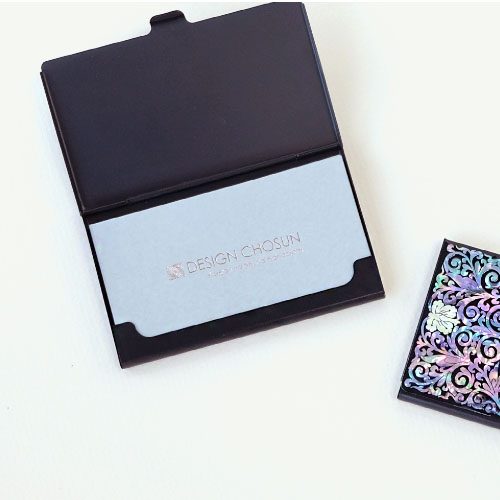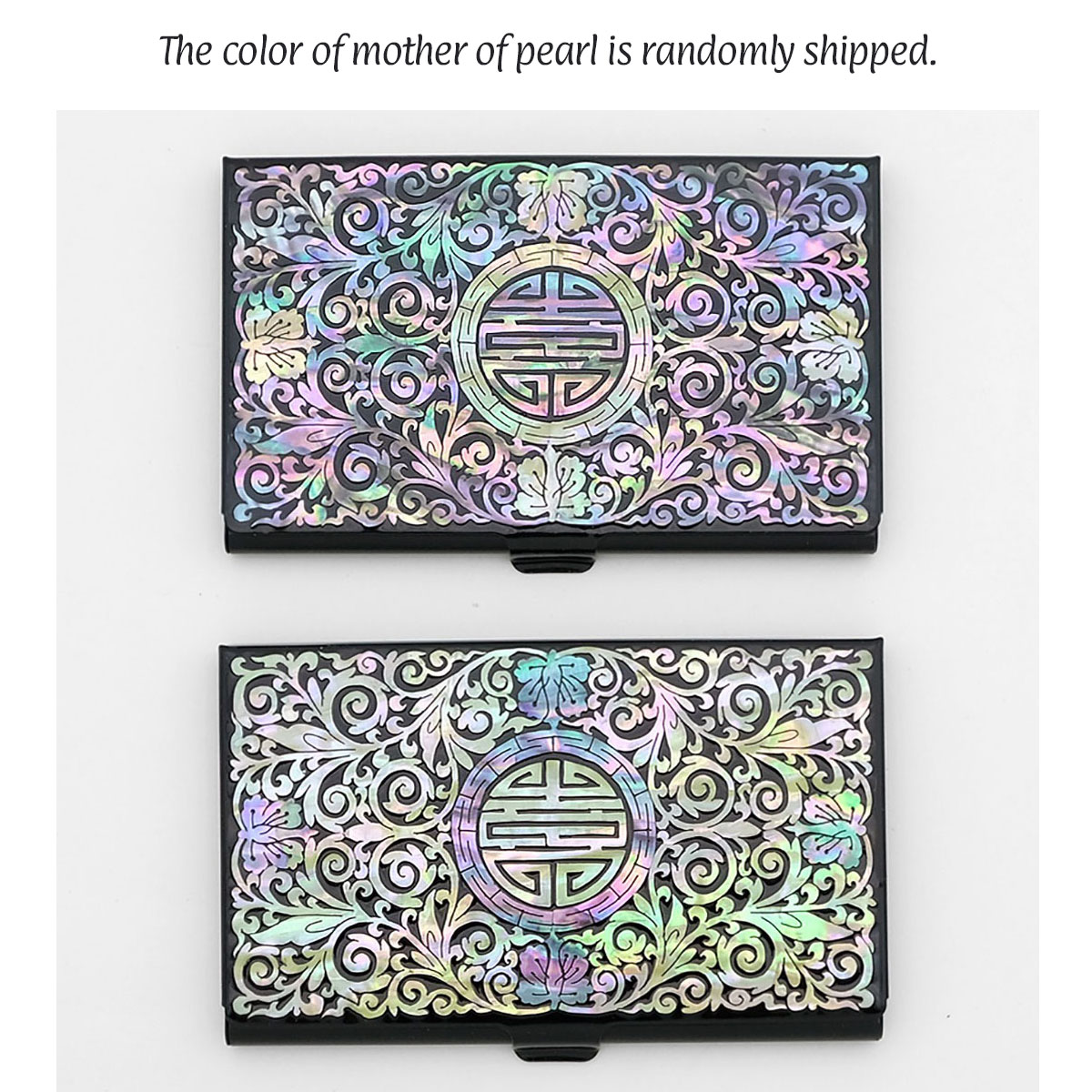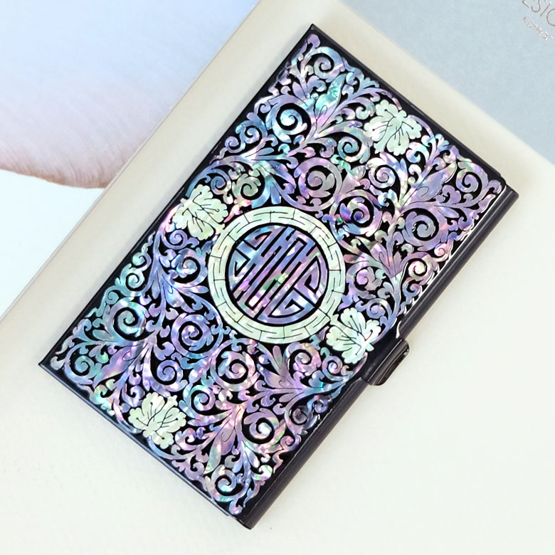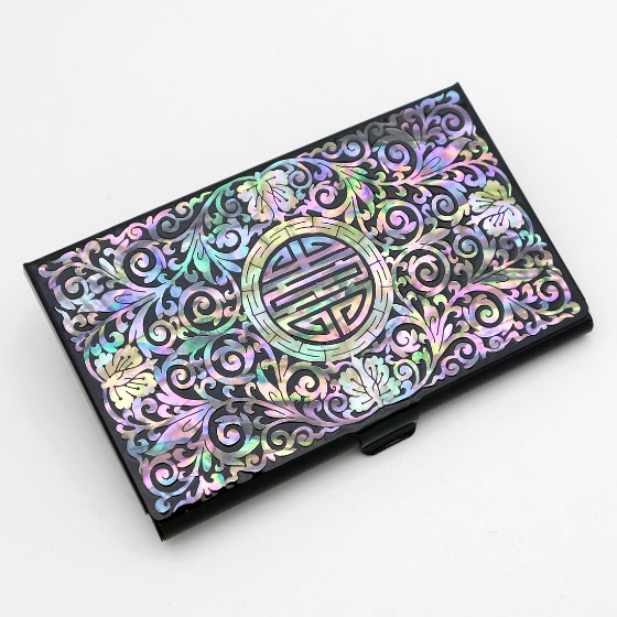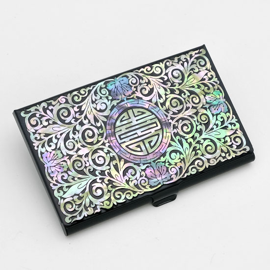 This unique mother of pearl inlaid designer credit card holder is ornamented with a luxurious mother of pearl design of fully bloomed arabesque blossoms and rhythmic lines and whorls of the vines. The arrangement of intricate design's iridescence and color of mother of pearl creates wonderful harmony with the black background, making it a remarkably attractive piece. The embossed mother of pearl design on the surface is pleasant to the touch. This credit card holder comes with a nice paper gift box.